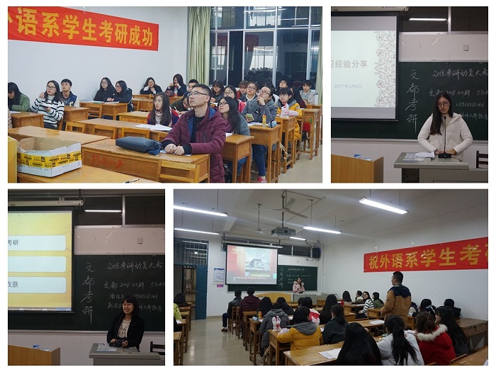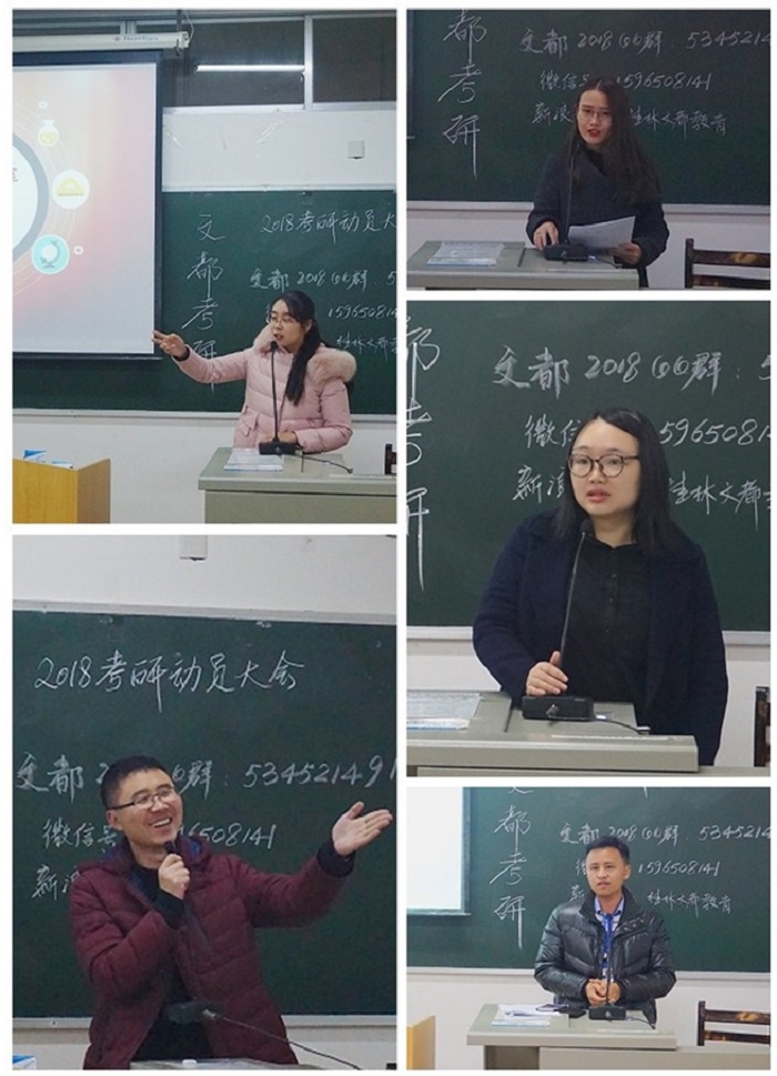 为调动我系学生考研的积极性,让学生更好的挖掘自己的潜力,得到更高层次的深造。外语系2014级学生考研动员大会于3月8日在1306举行,出席本次会议的有系副主任张超锋,专业教师李一枝,蒋瑛,黄艳丽,文都教育桂林主管,通过今年考研初试的优秀学生代表以及2014级外语系学生。