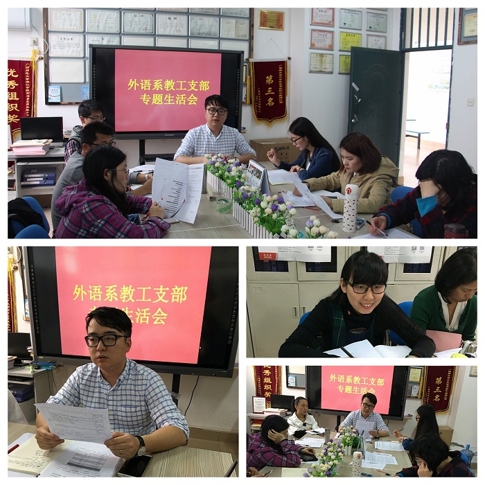 2017年4月5日下午2点,在外语系档案室,外语系教工支部召开了针对软弱涣散现象为主题的主题专题生活会,会议由外语系党总支书记陈俊杰主持,外语系教工支部党员参加了此次会议。