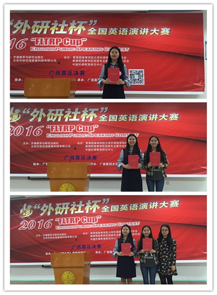 由外语教学与研究出版社,教育部高等学校大学外语教学指导委员会主办的2016 年“外研社杯”全国英语演讲比赛广西赛区复赛于11月6日在广西医科大学落下帷幕。外语系15级英语专业学生陆红,以及14级翻译专业学生陈荟雯代表我校参加该项比赛,分别获得广西区三等奖以及优胜奖的成绩。