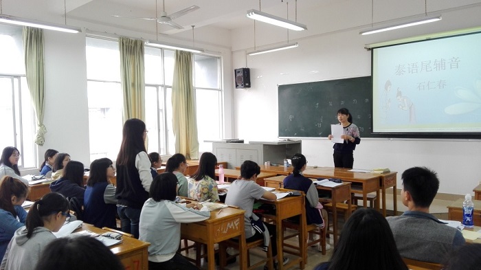 2016年11月7日周一上午一、二节课,外语系泰语教研室石仁春老师在2406教室就核心主干课程《泰语语音》尾辅音的内容上了一堂生动的公开课,泰语教研室的老师从旁观摩学习。课程以汉、泰语尾辅音的差异比较为切入点,针对汉语学生学习泰语尾辅音存在的问题逐一讲解,将学生们存在的学习难点逐个解决,最终学会了泰语尾辅音的正确发音。石老师教法新颖,详略得当,赢得在场师生的一致好评。