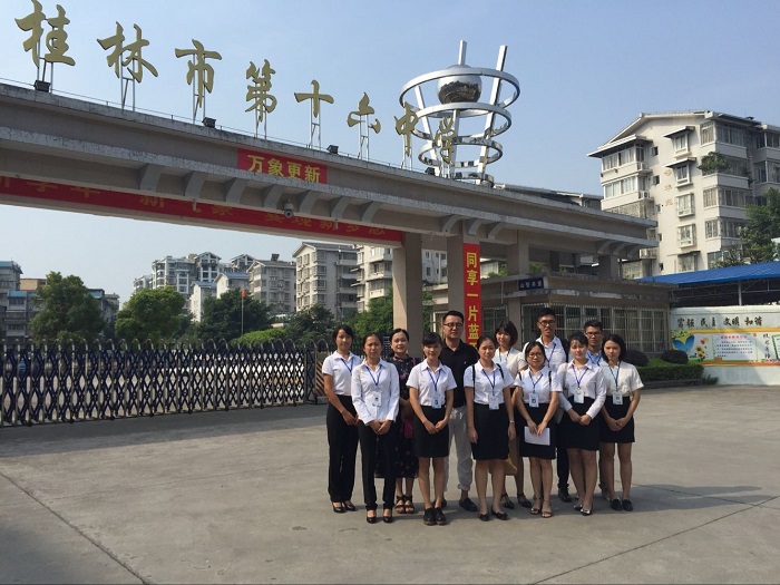 在学院和外语系领导的大力支持下, 2016年9月,我院外语系2013级英语专业的47名同学在外语系领导和秦一涵、杨晓敏、覃浩和陆海峡四位带队老师的带领下前往桂林八中、桂林十一中、桂林十六中以及任远中学开始教育实习。外语系英语专业校外跟校实习正式启动。