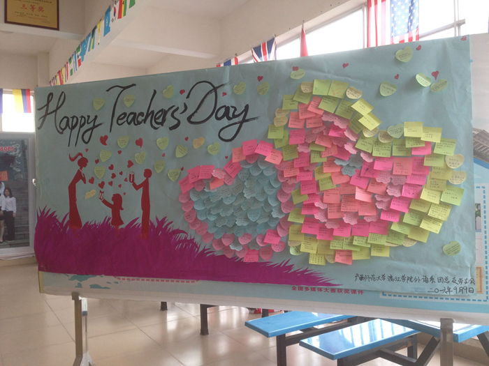 首先,外语系团总支学生副书记邹媛媛同学代表外语系团学所有成员们赠送礼物给外语系团总支书记石仁春老师;同时,团学各部门工作人员们也积极为老师们打扫办公室,以便减少老师们平日里工作的辛劳;外语角的展板也布置完毕,上面一张张颜色艳丽的便签纸记录着同学们对老师们衷心的祝福,成为一道靓丽的风景。