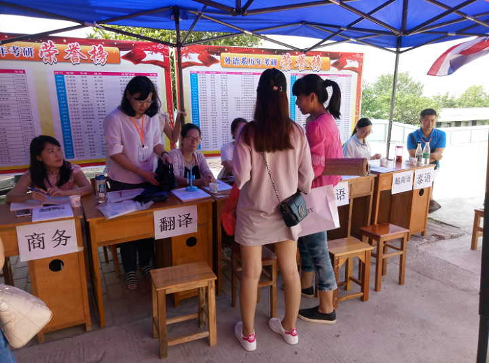 作为首届大类招生培养的学生,今后的专业选择与就业方向成为了很多家庭关心的热点问题。为了让家长方便快捷的对我系专业有所了解,考虑到新生报到,家长随行的比较多,外语系在此次迎新工作中于东四寝室门口特意设置了新生专业咨询点,为外语系新生提供关于专业的意向性指导。我系领导班子、各教研室专任教师主要承担咨询解答的工作。老师们与新生和家长亲切交流,耐心回答解决了新生关于英语专业大类专业选择遇到的问题。酷热的天气并没有阻止老师们和志愿者的热情,反而更加用心的投入到服务新生的工作中。辛勤的付出也获得了新生及家长的赞赏。很多家长都表示,心中的疑惑解开了,把孩子留在外语系学习就放心了。