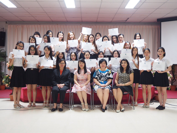 晚会伊始,商会大学Assistant Professor Dr.Tanisaya Jiriyasin上台做开场发言,她肯定了同学们三个多月以来的努力以及取得的进步,同时表达了对大家今后在学习、工作和生活上的美好祝福。紧接着的是结业证书授予仪式,25名同学按顺序依次上台领取结业证书并与老师合影留念。随后,一段关于同学们在商会大学留学生活点滴回顾的视频开启了同学们追忆商会大学三个多月的时光。