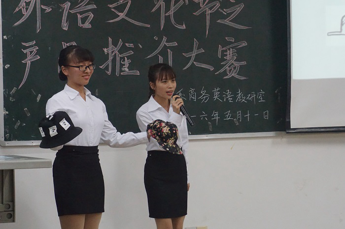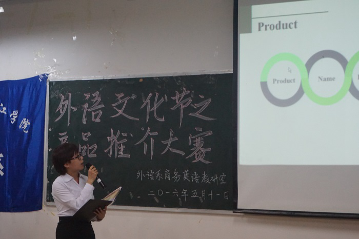 2016年5月11日晚,外语系商务英语专业于1504开展产品推介大赛决赛。出席本次决赛的评委有来自商务英语教研室的俞蓓老师和外教Julius,这次比赛由2012级商务英语班主办,三个年级共同参与,共有12组团队挺进决赛,每位选手都全力以赴地冲击冠军。