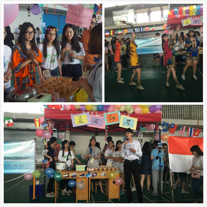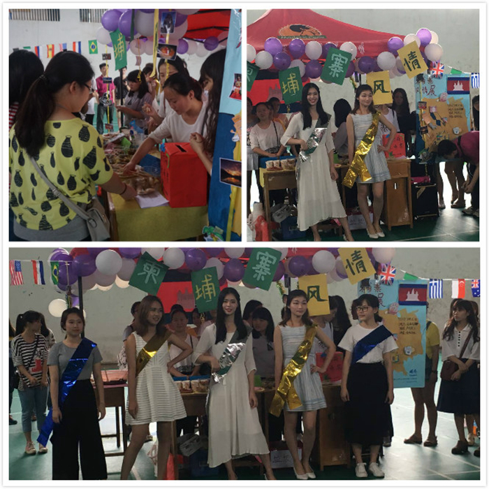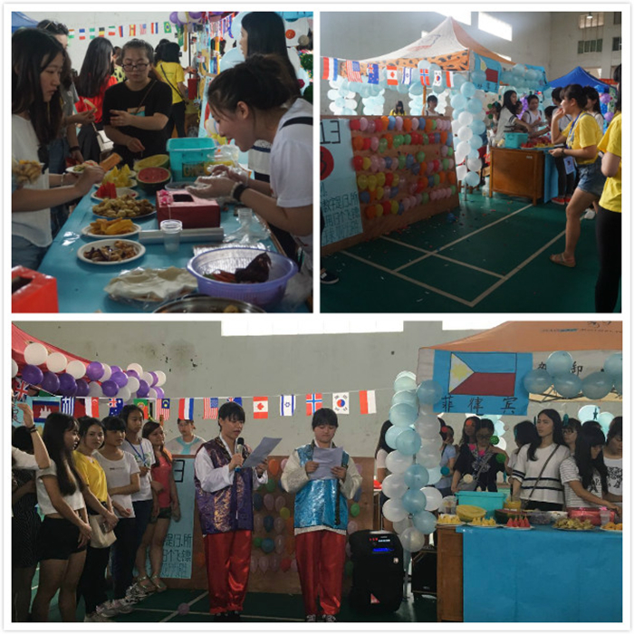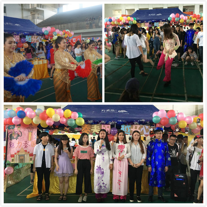 越南和泰国组合的展区上的“泰美丽,越开心”抢眼的文字,吸引了同学们的目光聚焦这里。具有优美迷人的热带风光的泰国,给我们带来了泰式椰汁鸡汤,烤椰塔的美食和阿娜并附有韵律感的泰国舞蹈,大家对其赞口不绝。而越南代表的同学也毫不逊色,有越南炸春卷、越南凉拌菜、越南西米露、越南法棍等特色美食和称为奥黛的服装表演。