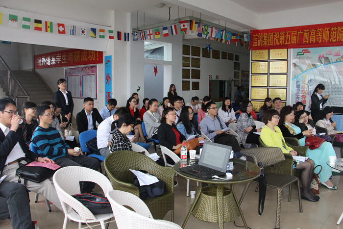 与会人员从覃翠芳同学的课堂切入进行研讨,讨论分为中学教师组和高校教师组。讨论结果表明在高校转型背景下师范类人才培养应具备以下素质:1. 热爱本职工作,全身心投入。在教学中,教师尽可能给每位学生提供机会,关注学生每一点进步、变化,多使用激励评价机制。教学实践中,在保证学生的共性发展的同时,充分注意不同学习水平学生和不同思维类型的学生在学习能力上的个别差异,用不同的要求、不同的措施使得快者快学、慢者慢学,使不同类型的学生都得到应有的发展。2.充满自信,保持良好精神状态。教师表现出的自信、积极,本身对学生就是鼓舞,精心设计教学的每一个环节,创设出优美的教学情境,探求科学有效的教学方法,追求最高效的教学效果。3. 提高教学质量,深钻教材。教师应大量吸取课外知识,不断充实自己,丰富自己。教师的语音、语调准确,有利于培养学生学习英语的自信心,有利于学生模仿,有利于学生敢于朗读,有利于学生准确掌握语言知识,才有利于学生主动深入到英语的学习中,最终学好英语。4. 合理调控课堂,营造良好学习氛围。教师应具备灵活高效选择运用教学方法的能力。教师应具备扎实的基本功,并有能利用现代化教学手段的能力。