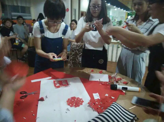 首先是主持人介绍传统文化精髓,全体成员奏唱团歌,伴随着优美的中国古典名曲《梁祝》,活动进入剪纸环节,同学代表向大家演示剪纸技巧,同学们跃跃欲试,纷纷加入剪纸活动并将剪好的作品张贴于会场周围,现场气氛欢快活跃。