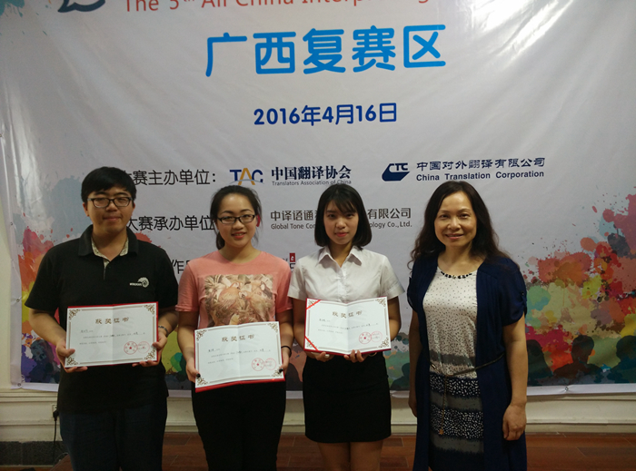 2016年4月15日到16日,我院外语系3名学生由翻译专业教研室主任熊惠琴等带队赴广西大学参加第五届全国口译大赛广西区复赛,喜获优秀奖。参赛选手为2013级翻译专业和英语专业学生:凌志行、黄夕君及梁月明。外语系翻译教研室教师团队分别于2016年3月23日及3月30日在校内展开了此次口译大赛的初试和复试;并在2016年3月至4月间为参赛选手提供赛前指导培训。 此次广西区复赛仅有广西大学行健文理学院及广西师范大学漓江学院两所独立学院参加。通过此次大赛,选手们了解了自身优势,更看到了与其他院校口译高手间的差距,激发了口译学习的兴趣和信心,希望外语系以后能有更多学生踊跃参与各种口笔译实践及赛事,提高语言应用能力,增强就业竞争力。