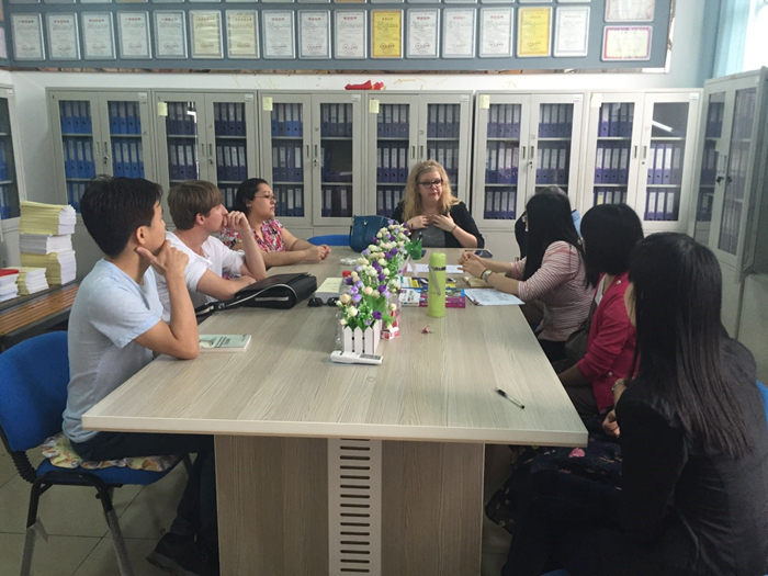 座谈中,教研室黄文敏、蒋玲利、杨晓敏、蔡晓明等老师与外教Julius, Gina, Cris, Kara以及泰国外教蔡鹏宇纷纷畅所欲言,围绕学院学生的英语语言学习习惯、学习风格、教学进度、课堂教学组织、教学设计、课后练习等进行了有效的探讨,并对接下来的教学活动进行了交流。