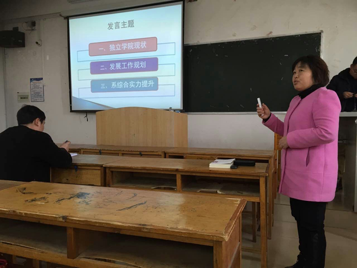 会议最后,外语系主任何玲就广西独立学院现状与我系发展规划做了汇报。她通过数据对比了区内院校外语院系的现状和发展特点,提出了我系结合学院转型发展在“十三五”开局之年的重点工作。从考研、学生能力符号提升,师资队伍建设和课改工作等方面做了详细的分解布置。