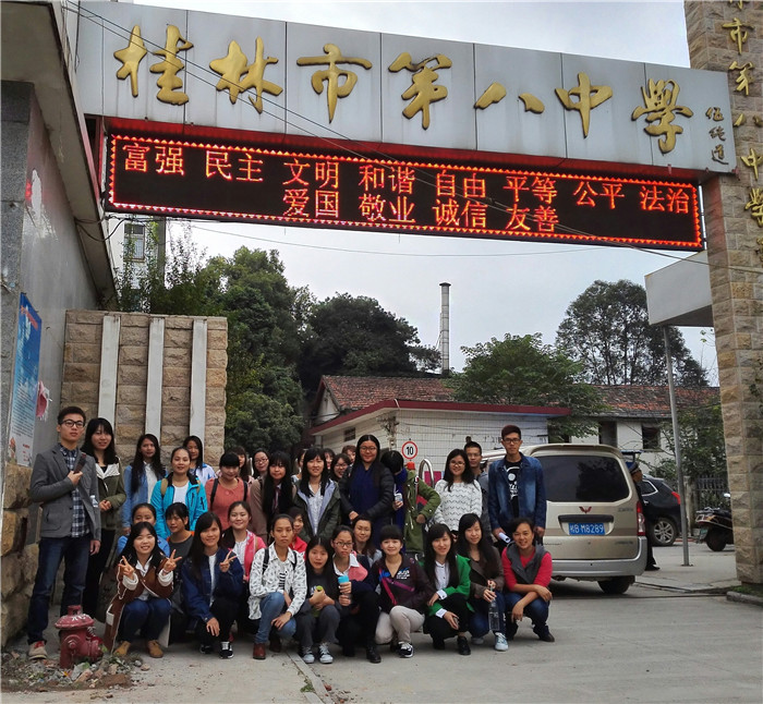 为了加深英语专业(教育方向)的同学们对教师教学技能的了解和学习,将英语教学的知识从理论学习转化到实践中具体运用。外语系《英语教学法》课的任课教师于2015年11月24日-12月4日组织同学们走进桂林市第八中学开展英语教学的实践性教学见习活动。