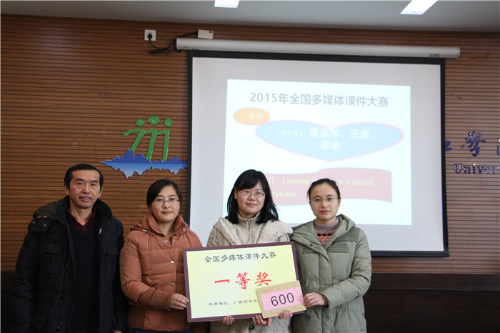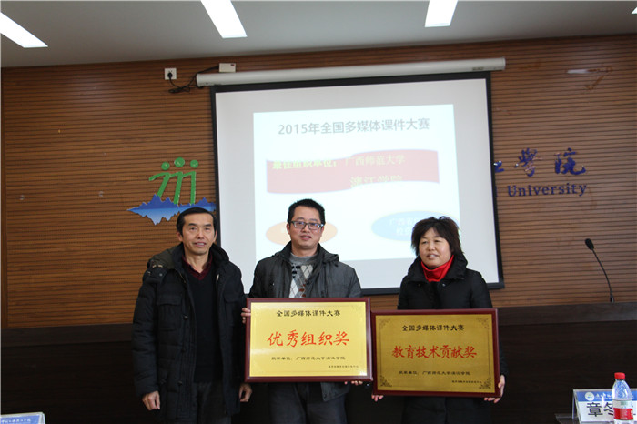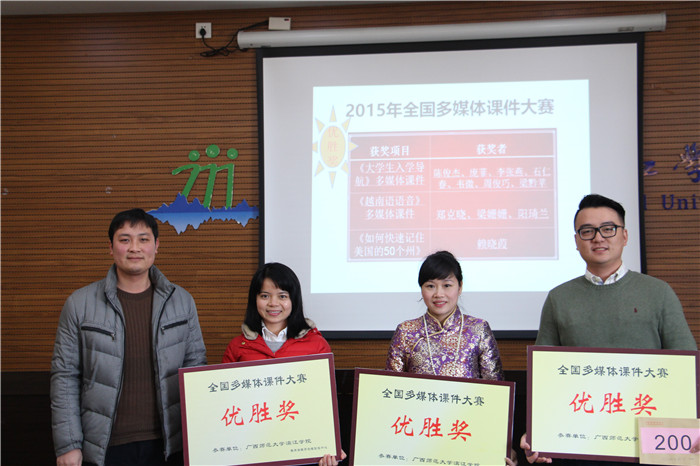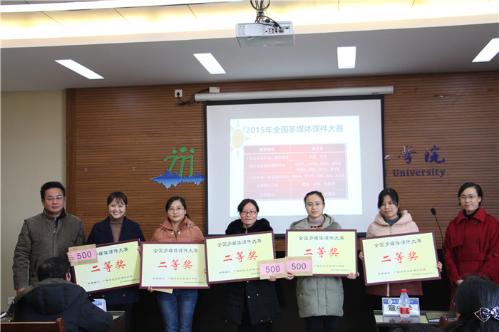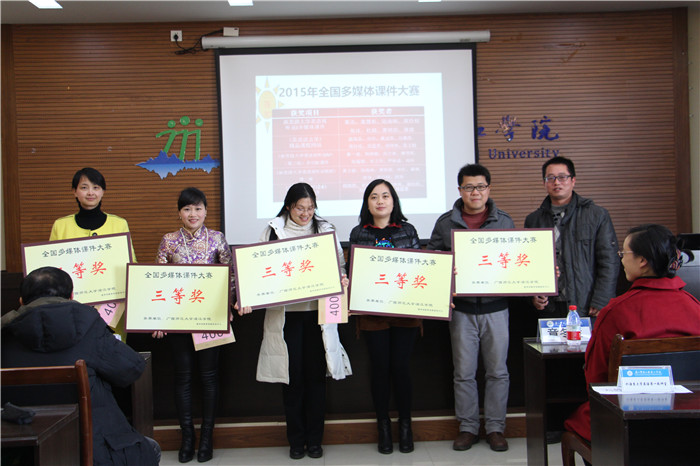 2015年12月16日下午,在 3301会议室举行了第十五届全国多媒体课件大赛暨第十五届广西高校教育教学软件应用大赛颁奖典礼。学院院长周世中、副院长章冬兰、副院长刘文革、教务与科研处处长颜小华以及外语系全体教职员工出席此次颁奖典礼。