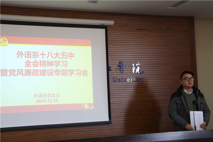 月16日下午外语系党总支在3301会议室组织召开了十八届五中全会精神学习暨党风廉政建设专题系列活动,外语系全体教职工参加了会议,党总支书记陈俊杰担任会议主持。