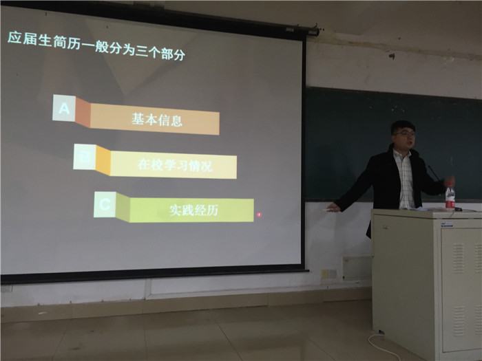 讲座开始,陈俊杰首先整理罗列了制作求职简历的原则并结合大学生的实际需求和现实情况,讲解了许多制作简历过程中的细节以及要求。讲座上他还强调,简历上的个人信息必须真实准确、内容设计有闪光点,让自己的简历简洁却不乏吸引力。他还拿出我院历届学生的优秀简历与大家分享。