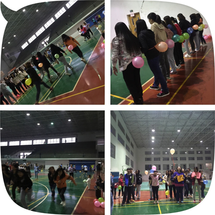 第一项游戏为“What's your name",意在让同学们在最短时间内牢记队友的名字、性格及爱好,增进同学间的交流。游戏过程中,有的小组因为激动而不停比划,抓狂跺脚,引发全场的连连爆笑;也有的组员火速憋气,复述队友所陈述的所有信息,用时短而取得可喜分数。游戏二为“What time is it now”,每组分别选出本组的“老狼”,其余为羊群。两组分别对赛。其中“TF girls”组由于男生优势,在对方的狼尚未警觉时率先跨到其身后成功戳破对方的气球,此时活动进入激烈角逐。最后一项为“follow  me”,各组同时进行小组顶气球接力,“TF girls”组以最快的速度奔向终点,其他小组紧跟着陆续抵达。