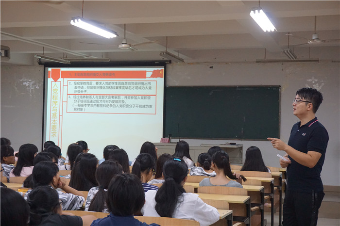 陈俊杰分别从党的性质、目标、指导思想及中华民族复兴梦等方面出发,剖析中国共产党的发展历程,帮助新生认识自己,认识党,明白如何将个人追求融入到党的最高追求当中去,如何完成从组织上到思想上入党的转变。在解析党员发展流程中:书记简单而要的介绍了成为一名党员应走的路线,为同学们指明方向;最后,他着重强调了党员材料书写规范及要点:陈书记对入党相关材料进行了耐心的讲解和详细的说明,包括申请书的基本格式、申请书的内容、书写应注意的问题、思想汇报的写作方法、思想汇报所包含的内容、格式要求、学生党员材料等相关事宜,严格入党程序,规范材料书写,为同学们积极向党组织靠拢做好材料规范书写的准备。他还用自身的入党经历警示同学们在成为一名党员的路上充满着了挑战与考验,希望有志之士能做好充分的准备,克服困难,早日成为一名优秀的共产党员,有一名优秀的当代大学生。