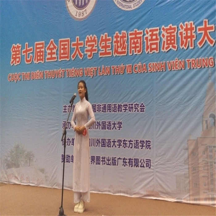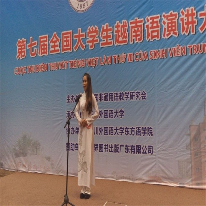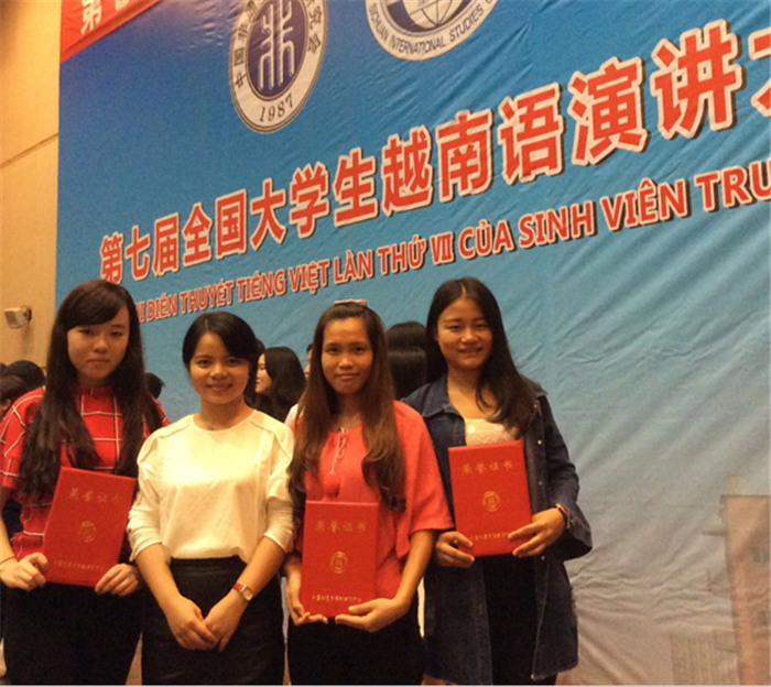 9月28至30日,第七届全国大学生越南语演讲比赛暨越南语教学研讨会于四川外国语大学正式召开。会上汇聚了来自北京大学,北京外国语大学,广西民族大学等二十多所在非通用语教育教学方面国内领先的高校教师和选手。我院越南语专业唐苑丹、李雯超、赖秀华3名同学在越南语教研室主任郑克晓老师的带领下参加了此次大赛。赛中,我院3名选手身着越南传统服装(奥戴),用流利的越南语形象、生动地进行了主题和即兴演讲,最后2名同学分别获得了大二年级组的二等奖,1名同学获得了大四年级组的优秀奖。