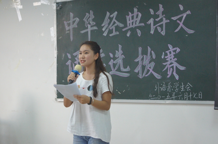 为了更好地响应学院语委2015年中华经典诗文诵读大赛,贯彻落实《国家通用语言文字法》,弘扬民族传统文化,推进中华经典活动的开展,同时给我院同学提供一个展现自我的平台。促进学生养成读书、诵读的良好习惯,提升学生审美情趣和文学艺术素养,营造和谐的人文校园氛围。外语系团学于2015年6月17日晚上19点在1505教室成功举办了2015年中华经典诗文诵读选拔大赛外语系初赛,外语系团学副书记周俊巧老师及外语系团学学生会副主席甘宏静担任本次比赛评委。