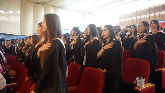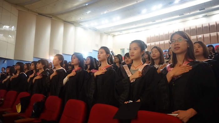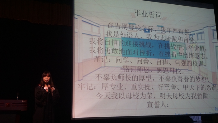 接着,毕业生代表周佩璇、方佳萃上台发言。英语专业的周佩璇同学表示,告别了学生时代,未来将担任不同的角色也担任着不同的责任,相信他们这届毕业生都能胜任未来的工作,以最积极饱满的状态迎接未来。泰语专业的方佳萃同学则回忆了很多过去学习和生活温馨的画面,并承诺一定会牢记老师们的谆谆教诲,用努力和成功来回报社会。