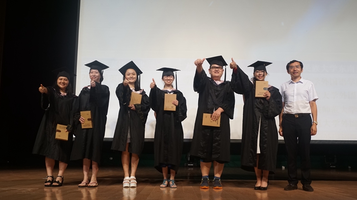 整场毕业典礼最令人心潮澎湃的时刻当属院长周世中教授为2015届成功考取研究生的毕业生颁奖的环节,伴随激昂的音乐,一位位身穿学士服的毕业生从周世中院长手中接过荣誉证书,并合影留念。