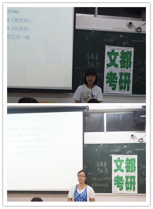 通过同学们在之前填写各自的考研方向及考研院校,文都机构负责人为同学分析了各院校的录取分数线并鼓励同学们尽力考取高分数,为能考取优秀院校而努力。研讨会接近尾声,文都考研机构考研成功的学姐学姐们也分享了各自的经验,学习中要积累经验,掌握技巧,选择考研专业及培训班的选择技巧及其作用。整个交流会在轻松的氛围下进行着,学长、学姐们既讲明了考研的重要,又提高了同学们的考研兴趣,交流会在一片热烈的掌声中圆满结束。