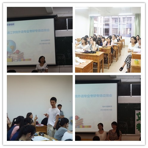 为使我系12级学生进一步了解考研知识及明确考研方向、院校等目标,给学子们提供更多考研经验,外语系于2015年6月24日在1302教室举办了考研研讨交流会。本次交流会邀请到12级辅导员韦微及其2015届考研成功的毕业生代表、文都机构考研成功的学姐为同学们介绍自己的考研心得。