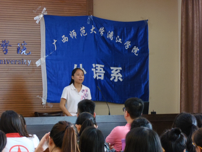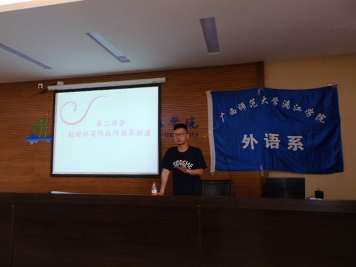近日,由广西师范大学漓江学院外语系团总支学生会科技科技创新办公室主办的大学生创业经验交流会暨创新杯写作技巧讲座在3301会议室举行。出席本次活动的嘉宾有党总支书记、学工部副部长、院团委书记以及2014届英语毕业生李泓佩宜。我系学生创业团队代表也到场进行学习和交流。