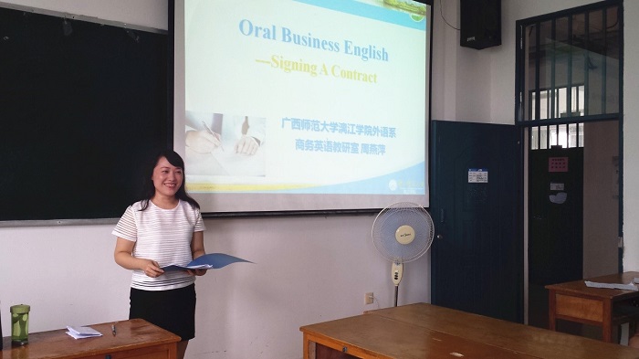 5月29日上午,商务英语教研室的周燕萍老师在二区教学楼2306教室开展了《商务英语口语2》第12单元的公开课。何玲主任、商务英语教研室俞蓓老师、2014级商务英语专业学生聆听了本次公开课。