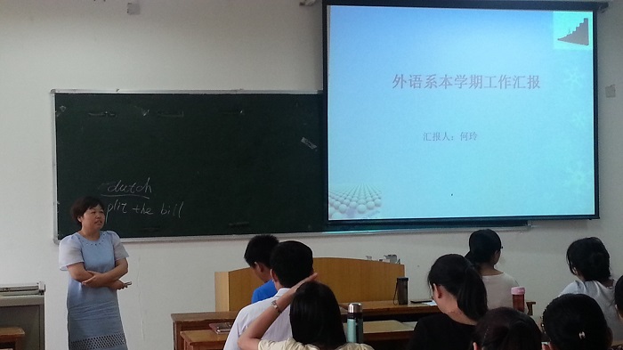 最后,系主任何玲老师会上作了总结发言:外语系全体师生通过近年来的摸索和实践,已经为专业的转型积累了一定的经验,取得的成绩也得到了学院领导和其他同行们的认可,但现阶段也不可避免地存在或多或少、或急或缓的问题需要解决,全体老师一定要居安思危,进一步思考在高校转型背景下,明晰办学定位;进一步提升教学质量,大力开展师资培训,加强对教职员工个性化关心和关注,切实提高应用技术型人才培养的质量,实现外语专业转型发展需要外语系每一位师生的共同努力,积极主动的顺应高等教育发展的普遍规律,认真仔细的思考人才培养方案、专业发展思想是否得到充分论证,课堂教学质量是否真正转变。何主任最后希望大家开拓思路,多视角思考,充分展开讨论进行交流切磋,为外语系的转型发展献计献策。