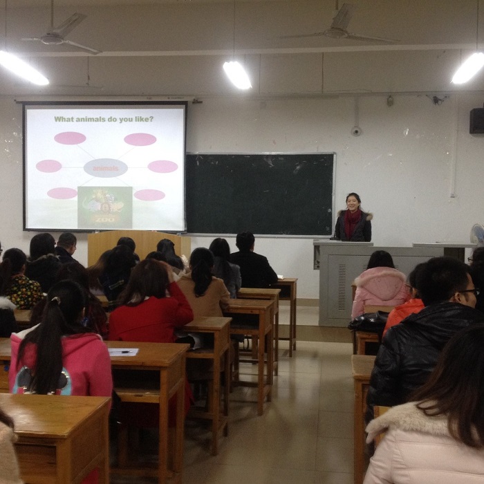 首先,外语系语言实践教研室张超峰老师对2015届毕业生实习工作进行总结。之后,实习指导老师代表秦一涵对学生实习情况做了点评,肯定了实习过程中同学的表现,并提出实习中需要完善的地方。接着,商务方向实习的学生代表张毅上台发言,与大家分享他们的实习经历,与大家交流从实习中获得的心得体会、经验和启示;教育方向的实习代表赵娜彦等上台给大家做了精彩的教学展示。