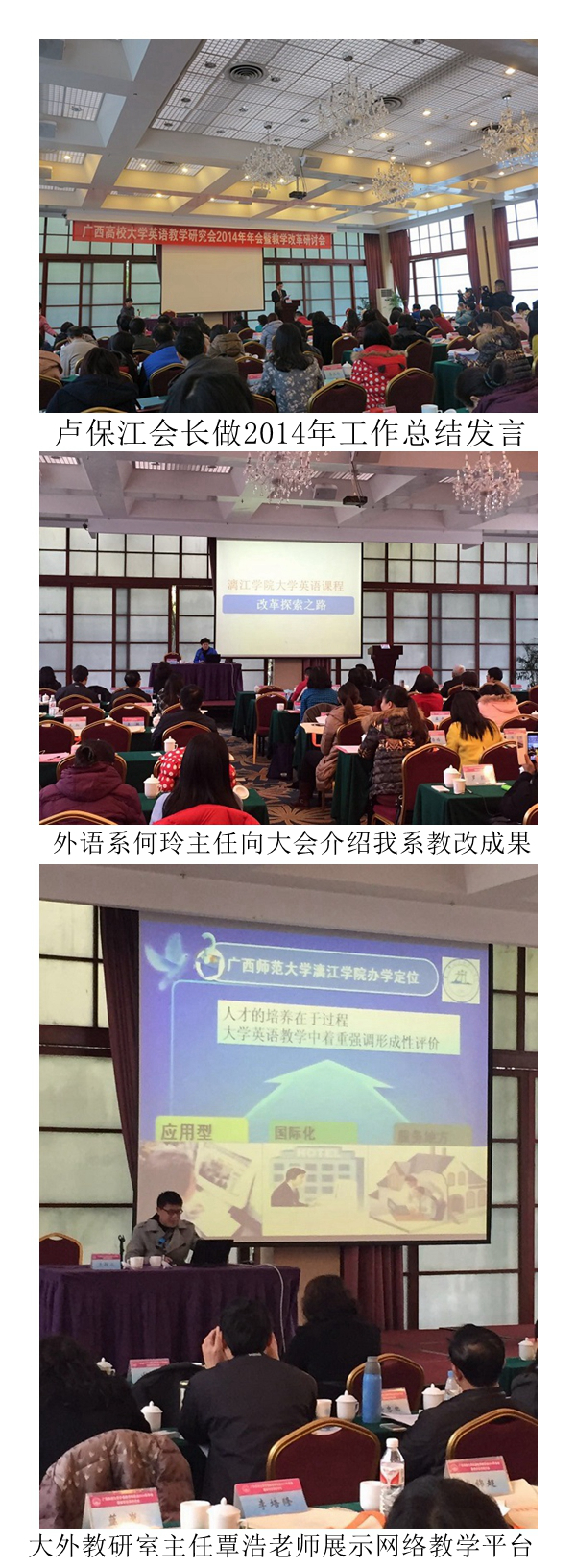2015年1月10日,由广西师范大学承办的广西高校大学外语教学研究会2014年年会暨大学英语教学改革研讨会于在桂林观光大酒店顺利举行,本次年会共有来自区内20多所的百余名代表参加此次会议。