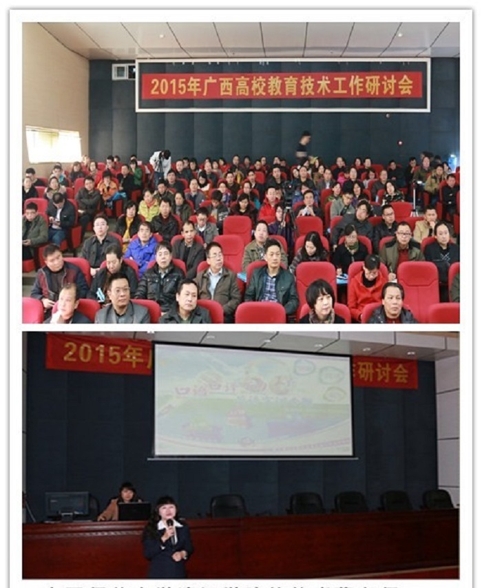 会议首先由广西高等教育学会高校教育技术专业委员会秘书长胡华进教授总结了2014年的工作,并对2015年工作计划和目标进行了简要说明;随后,胡秘书长宣布了2015年第十五届广西高校教育教学软件应用大赛各校所获奖项;其中,我系作品《口语口译听力英语实训专题》作为本次大赛的一等奖及最佳教学设计奖,应大会组委会邀请,由赖晓葭、周燕萍两位老师进行了展示,广西医科大学李波教授对作品进行现场点评。
