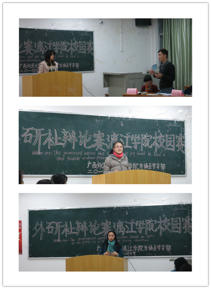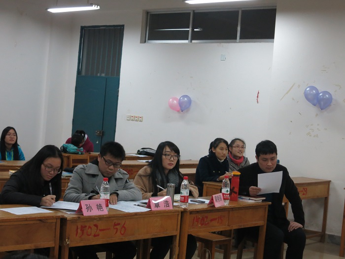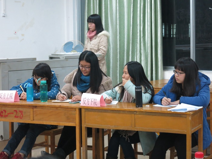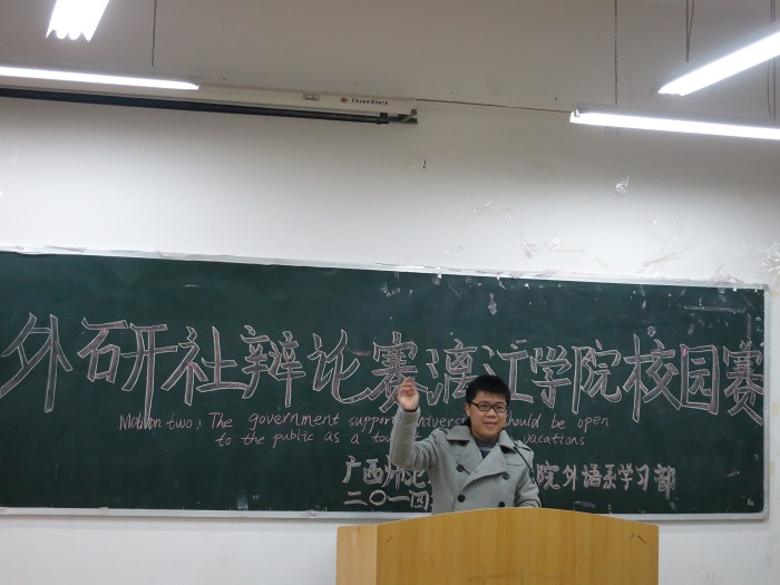 为了深入开展培育和践行社会主义核心价值观活动,引导和帮助广大青年学生强化勤学意识、提高明辨能力、培养国际眼光,2014年12月10日晚上19点,由共青团中央学校部、全国学联秘书处、北京外国语大学主办、院团委、外语系承办的第十八届“外研社·京东杯”全国大学生英语辩论赛广西师范大学漓江学院校园赛在1502教室举行,外语系教师覃浩,黄艳丽等担任评委。