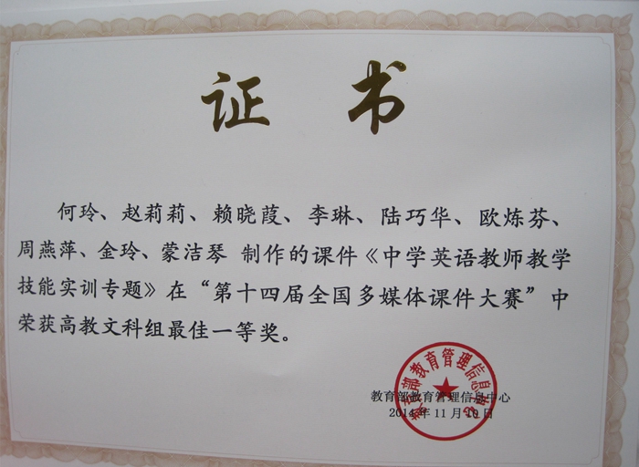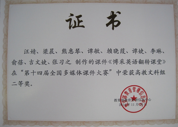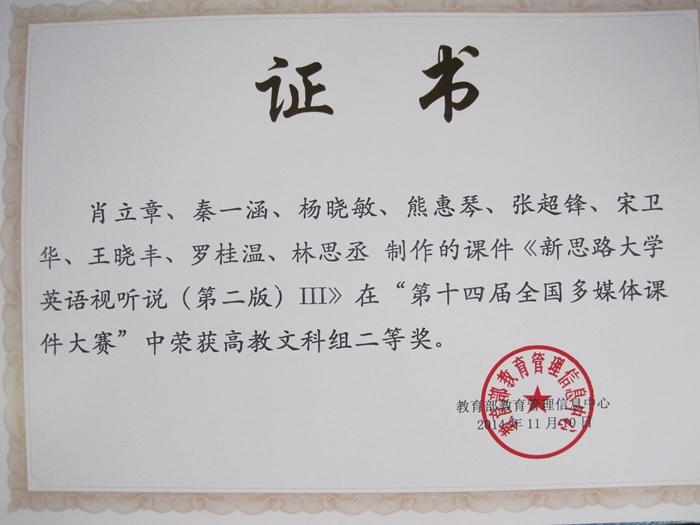 APEC会议在北京热烈举行的同时,由教育部教育管理信息中心主办的“第十四届全国多媒体课件大赛”也于201411 8-10日在京拉开盛幕。本次大赛共收到作品2817件,其中入围决赛的有420件作品。广西师范大学漓江学院共有三门课程的多媒体课件入围全国总决赛,并在比赛中表现优异。其中《中学英语教师教学技能实训专题》多媒体课件获全国一等奖,《博采英语翻转课堂》和《新思路大学英语视听说(第二版)III》多媒体课件获二等奖。