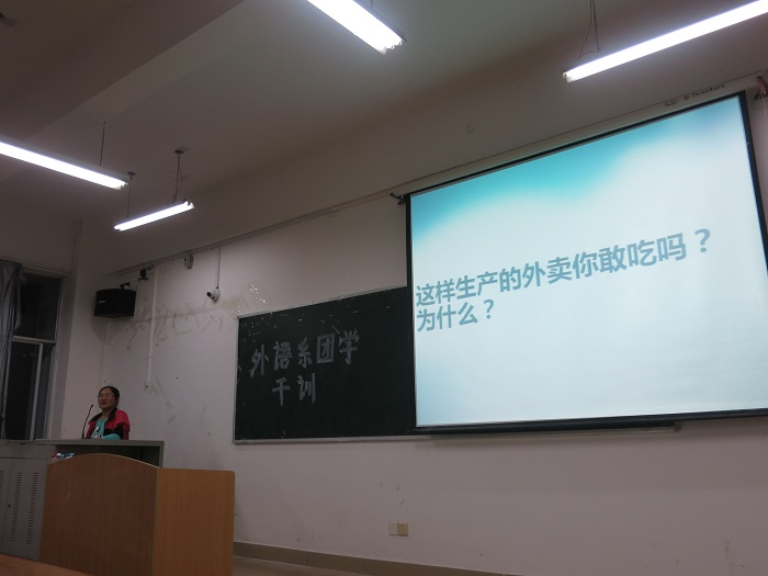 外卖方便快捷,在校园中拥有广大的市场。但其中隐藏得食品安全问题令人堪忧。周俊巧老师首先讲叙了我院学生现外卖量大的情况,用一些真实的由不正规外卖引起的集体食物中毒的例子,引出校外摊点大多属于三无监管状态的事实,用鲜活的图片展示了一些不法商家的食品卫生问题及白色污染对环境的危害。一张张图片令人触目惊心。在场的同学纷纷唏嘘不已。最后老师希望同学们能拒绝外卖,为自己的健康负责。同时也希望同学们能放心去学校的食堂就餐。