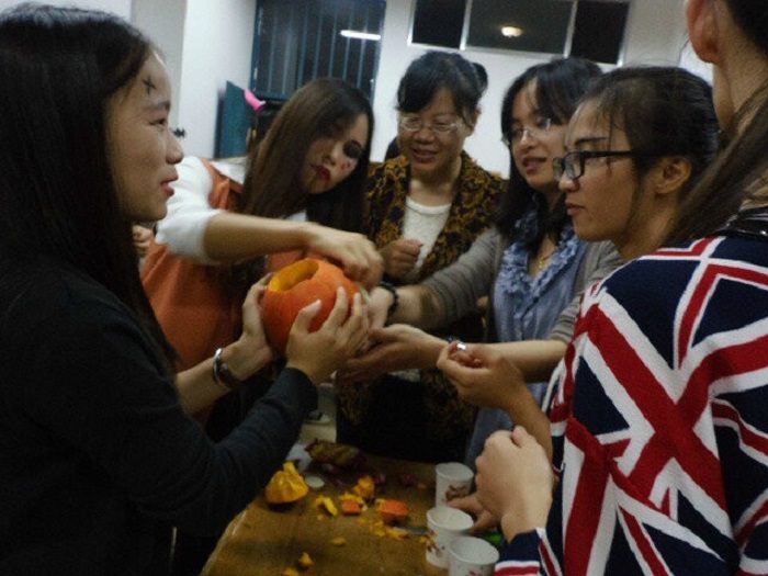 晚会伊始,通过视频分享,同学们了解到了万圣节的起源、演变及主要的节日习俗等知识。虽然万圣节的由来版本不一,但当晚同学们还是用穿上奇装异服,戴上面具,诠释自己对于万圣之夜的理解,彰显自我个性。紧接着,外籍教师Julius为同学们分享发生在万圣节的童年趣事,最后在座的老师们还和同学们一起制作南瓜灯,并进行了一一展示,将晚会气氛推向了高潮。