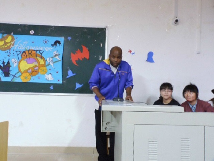 图为:外籍教师Julius讲述万圣节的童年趣事