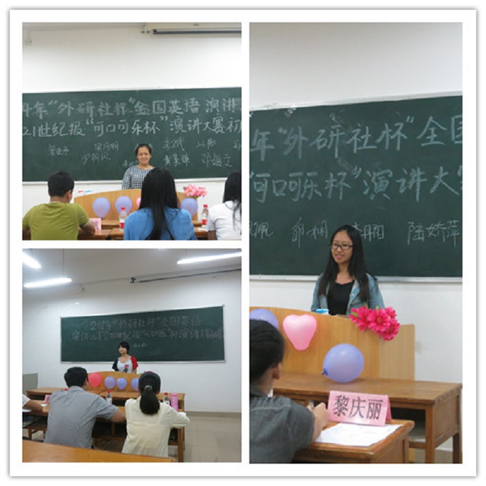 为加深对英语口语重要性的认识,调动广大同学学习英语的积极性并丰富同学们的课余文化生活,10月17日晚,由漓江学院外语系主办的2014年“外研社杯”全国英语演讲大赛暨21世纪报“可口可乐杯”演讲大赛拉开帷幕。本次比赛特邀我系肖立章,覃浩,蒋玲利等专业老师担任评委。比赛形式创新,以“change the unchangeable”为定题的即兴演讲。