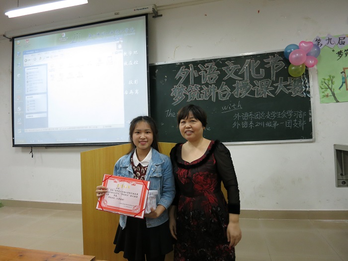 做一名优秀的教师是师范生的职业理想。为培养英语专业师范生的教师职业技能,外语系第九届“外语文化节”开展了“梦筑讲台”授课大赛。经过初赛选拔,共有10名学生进入决赛。5月8日晚,决赛在1501教室进行。决赛特邀桂林市八中主管教学的副校长和英特尔培训学校校长担任评委。