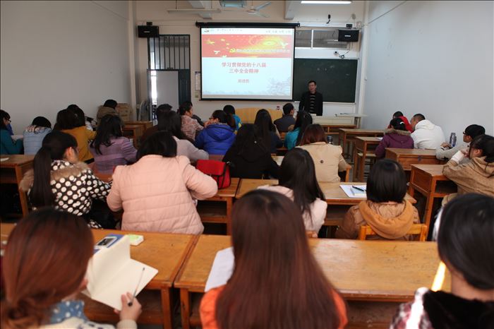在专题讲座中,外语系党总支书记首先介绍党的十八届三中全会召开的背景和重要意义,然后对十八届三中全会通过的《中共中央关于全面深化改革若干重大问题的决定》进行讲解。他将《决定》中的16部分内容进行了简要分析,帮助党员们理解全面深化改革的重大意义、指导思想、总目标、改革重点等内容,对老师们关心的教育改革、社会保障制度改革、计划生育改革等内容联系实际进行解读,让老师们吃透《决定》的精神。