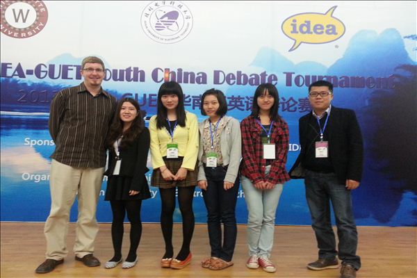 这是我院首次组队参加大学生英语辩论赛。此次华南区英语辩论赛是由国际辩论教育协会(IDEA)主办,桂林电子科技大学与美国威莱姆大学(Willamette University)承办,共有来自华南地区深圳大学、华南农业大学、广西大学等13个高校40只队伍参赛。
