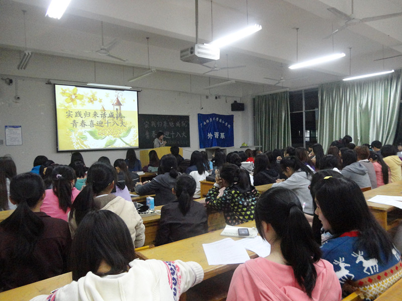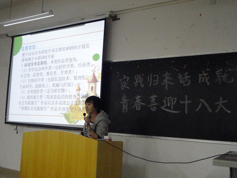 在本次交流会中,为了响应“挑战杯”广西大学生课外学术科技作品竞赛与大学生创业计划竞赛,首先,温海燕副书记介绍了关于我院“创新杯”的相关内容并具体介绍了活动类型,竞赛要求,以及报名、选题、申报等程序的具体开展要求。随后,她向同学们展示了外语系2012年暑期社会实践活动的相关内容,与同学们分享了实践活动中的趣闻趣事、实践经验,归纳总结了实践活动中的收获与不足,给同学们在实践活动中存在的问题提出了切实可行的建议和方法。