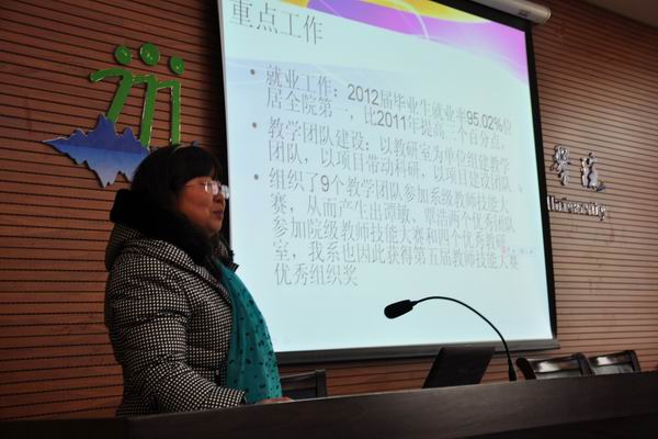 总结表彰会上,外语系主任蔡马兰从教学团队建设、专业建设、实践教学、创新考核、就业工作等方面总结了本年度外语系开展的工作和取得的成果,对为此付出辛勤劳动的全系老师表示感谢。系党总支副书记陈俊杰总结了本年度学生工作及取得的成绩。系党总支书记周德胜布置了放假前和下学期开学的工作,强调了安全稳定工作。系副主任何玲对本年度外语系的教学和科研工作作了简要总结,让表现突出的英语语言文学教研室、大学英语教研室、语言技能教研室用视频展示了他们开展的工作和取得的成绩,非常有吸引力和说服力。