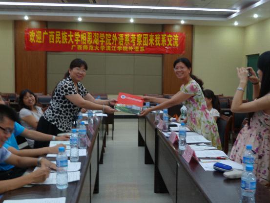 2012年6月18日上午,广西民族大学相思湖学院外语系一行4人到我院外语系考察。我系领导班子和各教研室主任出席座谈会。