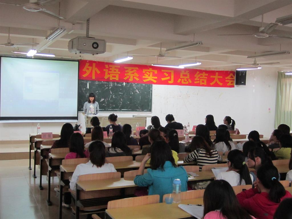 11月28日下午3:00于001教室成功举办了外语系08级英语教育方向实习总结大会,莅临此次总结大会的嘉宾有外语系主任蔡马兰老师,外语系主任助理、10级英语专业辅导员陈俊杰老师,08级英语专业辅导员韦微老师,09级英语专业辅导员庞菲老师,11级英语专业辅导员李张燕老师,11级越泰专业辅导员杨柳老师。参加本次总结大会的还有外语系08级英语教育方向的全体同学。