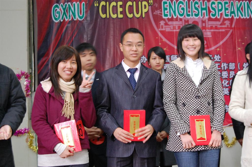 此次演讲比赛的主题为How to be popular?他们在赛前进行了精心的准备,磨拳擦掌,欲以最佳的表现展现给评委和老师。在赛中果然不负众望,王萍仪态优雅,发挥稳定,口语流利,反应敏捷,感情张驰,起伏迭宕,表现出色;丘小婷妙语连珠,她自信大方的姿态、地道纯正的口音、睿智的思辨能力、慷慨激昂的说辞和抑扬顿挫的情感获得了观众的阵阵喝彩;向瑞涛的一段动情流转的述说,一个坚定有力的手势,一种“一石千浪”的深思打动了评委们……最后, 王萍、丘小婷和向瑞涛三位同学均获得了三等奖的好成绩。