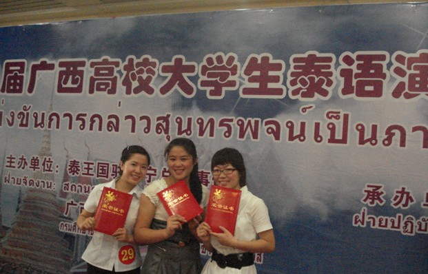 2010年5月22日 星期六,由泰王国驻南宁总领馆、广西壮族自治区教育厅主办,广西民族大学承办的第四届广西高校泰语演讲公开赛(复赛)于上午九时在广西民族大学大学生活动中心201室拉开帷幕,来自全区近二十所院校的47名选手参加了此次比赛,比赛不分年级,亦无专业组、业余组之分。我院选派的三名08级泰语专业学生:韦秋菊、秦润梅、吴光怡在激烈的角逐中均表现突出,成绩优秀,其中秦润梅同学顺利跻身前十五名,获得参加2010年6月12日 在广西科技馆举行的第四届广西高校泰语演讲公开赛(决赛)的资格。