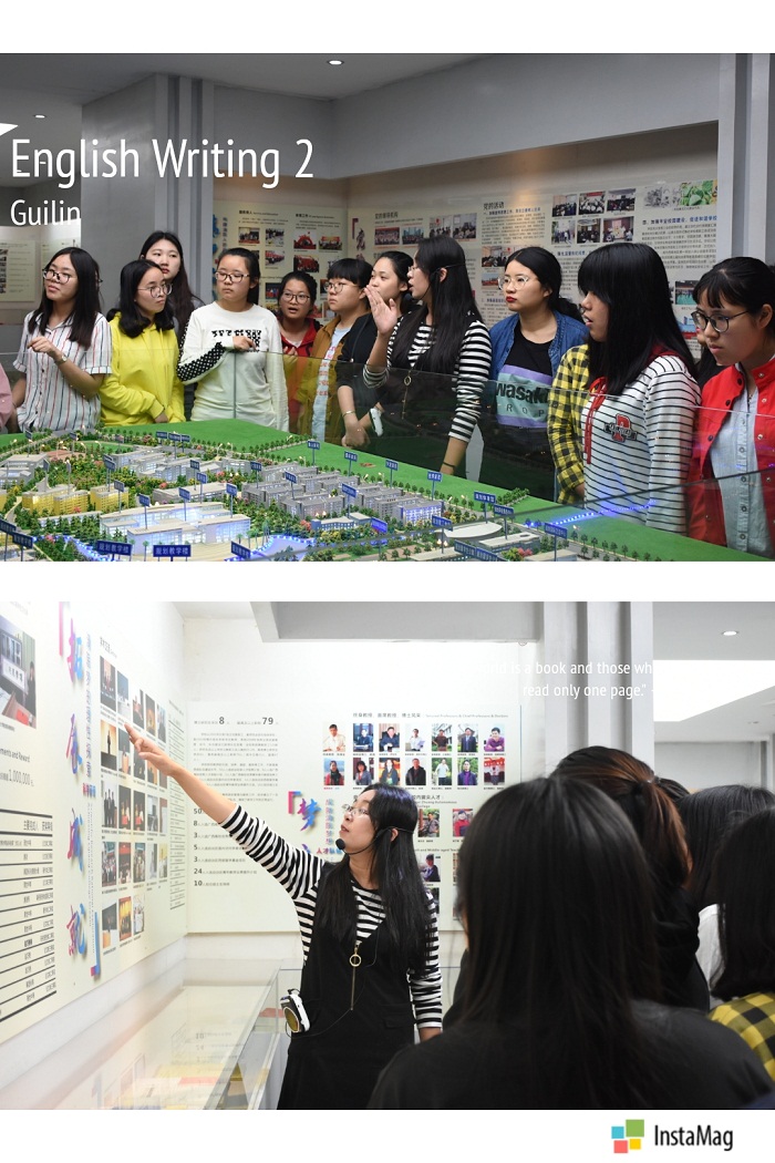 为让同学们更好地了解漓江学院发展壮大以来的校情校史,传承本院 “至善”文化理念,激发“知校、爱校、荣校、兴校”的自豪感、荣誉感和责任感,并达到将校史馆育人效能的完善与英语专业技能的提高有机结合,外语系李一枝老师组织外语系2017级同学们到我院的“办学历史与成果展厅”开展了一堂别开生面的英语写作课程教学,旨在用英语讲好漓院故事。