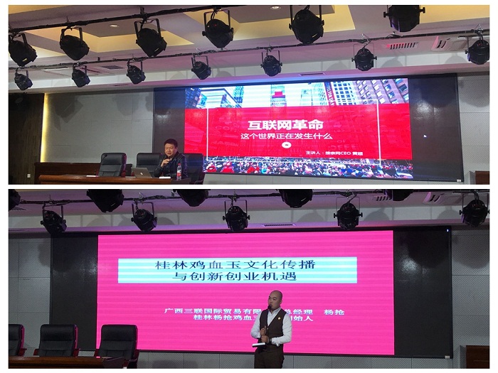 广西联京贸易有限公司总经理石淋元先生和桂林杨抢鸡血玉品牌创始人分别结合自己的创业经历,并根据同学们专业进行了创业分析,提供了创业思路。同时,为毕业生宣讲了创业的本质,创新、创造价值,提出经济共享的原则。